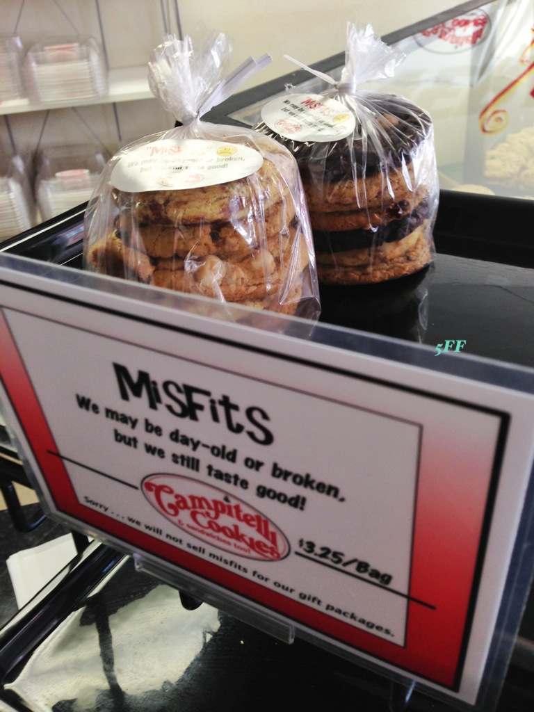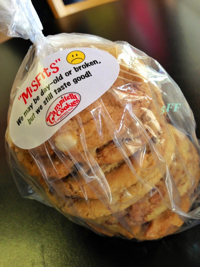 Interestingly, I had a hunch that, upon arriving a few hours before their closing time, they would plausibly run out of these day-old or broken cookies, called “The Misfits,” at half price of a fresh half dozen. Well that knocked out that notion when they just brought out 4 wrapped bags of these so-called oddballs. As a supporter of positively out-of-the-norm situations, I just had to seize these beauties in the bag, with the remaining destined for 3 other cookie consumers.