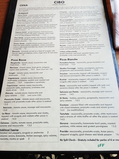 One tableau is Cibo, pronounced CHEE-bowh if going hardcore on Italian, where it brilliantly mimics a quaint house that frankly fit in with the neighborhood homes and apartments. The main difference, besides the purpose, was from the outside lots of patio seating were lovingly scattered for guests who were either plucky savoring the desert atmosphere or were interested in hearing the night’s music gig. Such tyros of the moistened heat gathered safe and sound inside a well-conditioned, unpretentiously homey interior, full of an equal ratio of crowding, all awaiting to have their hands full on Cibo’s renowned pizza, categorized in 2 statements–Red/Rosse and White/Bianche.