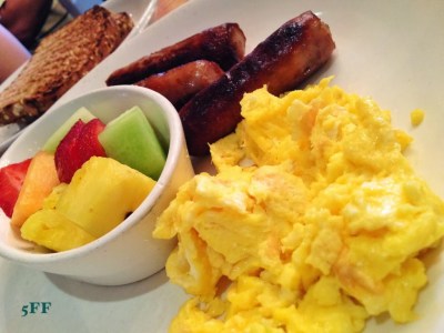 Scrambled Eggs w/ Fruit, Jumbo Sausage Links, & Wheat Toast