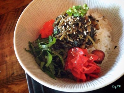 Or possibly dive into a more proportionally diminutive amount yet slightly intensifying Siragei, which is a rice bowl of dried radish greens slowly cooked with special soy dashi and baby anchovy, topped with masago and ginger.