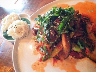 If eating within comfort zone frightens you, step your gastronomic game way up towards dishes like the Golbang Yi Muchim, roughly translated as Sea Snail salad with dried pollack and hot chili pepper sauce, alongside two small, slithery scoops of rice noodles.