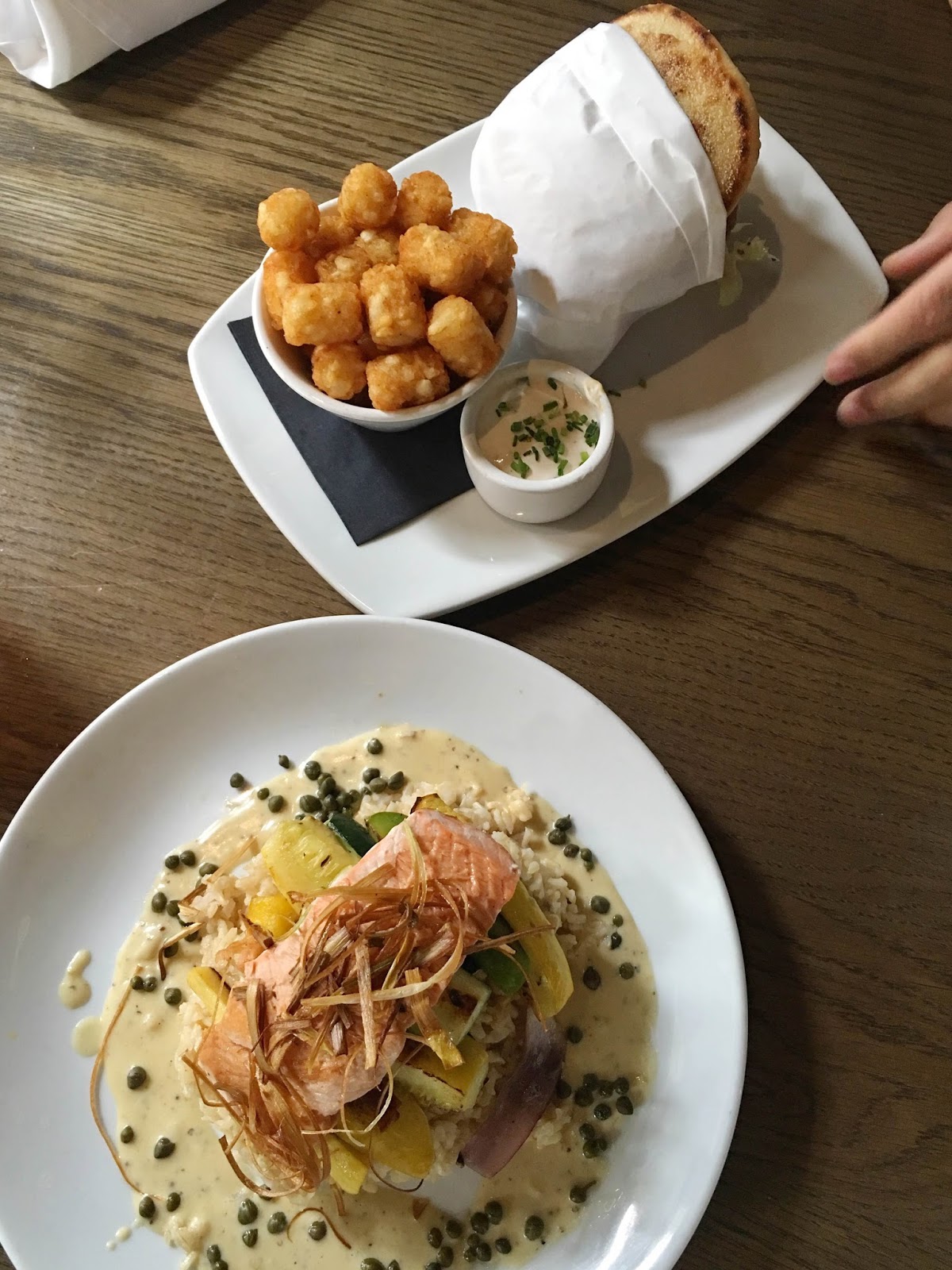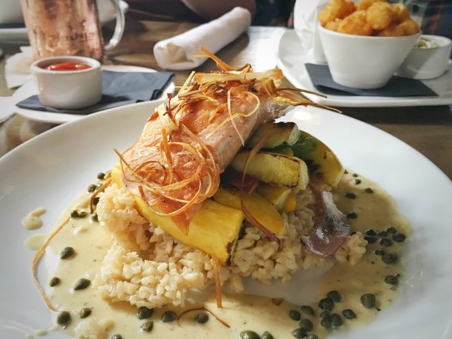 My Pan-Roasted Salmon consisted of unexpectedly fluffy brown rice, roasted zucchini and Italian squash, lemon (juice), fried scallions, capers, and the astoundingly delectable whole grain mustard cream. This cream enlivened the tender fish even more that if social etiquette deemed it acceptable, I would seriously like the plate clean–but leave remnants of the excessive rice and veggies.