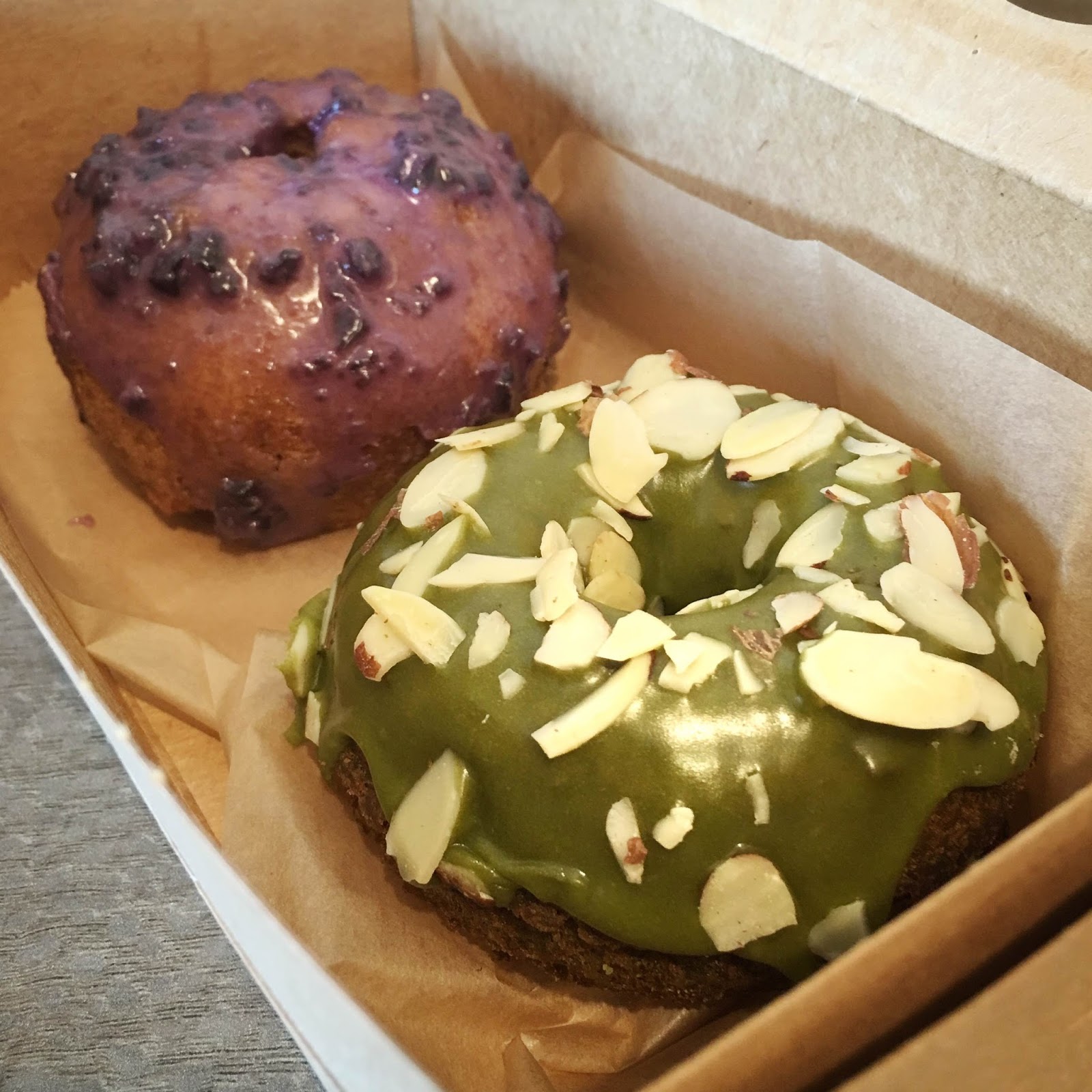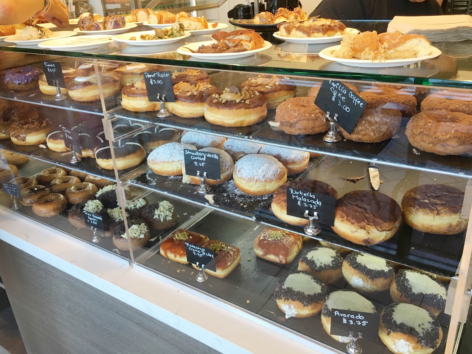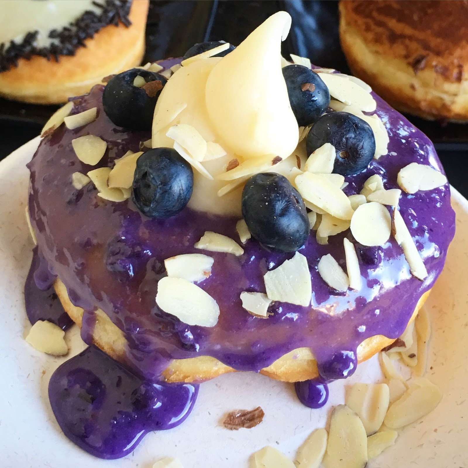 Without going rather insane on the flavors to instead focus more on a tried-and-true approach, a staff member helped me construct a simple glazed doughnut topped with that aromatic, gorgeous glaze; fresh blueberries; sliced almonds; and cream cheese in the center.
