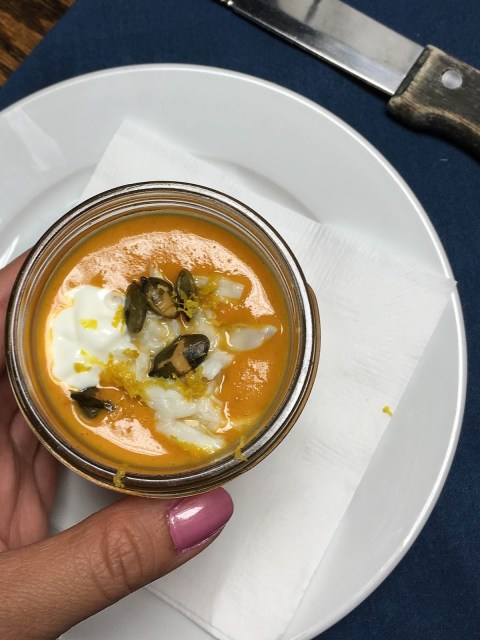 Course 1: Kabocha Squash Coconut Curry Crab Soup topped with Creme Fraiche, Yuzu Zest, and Pumpkin Seeds