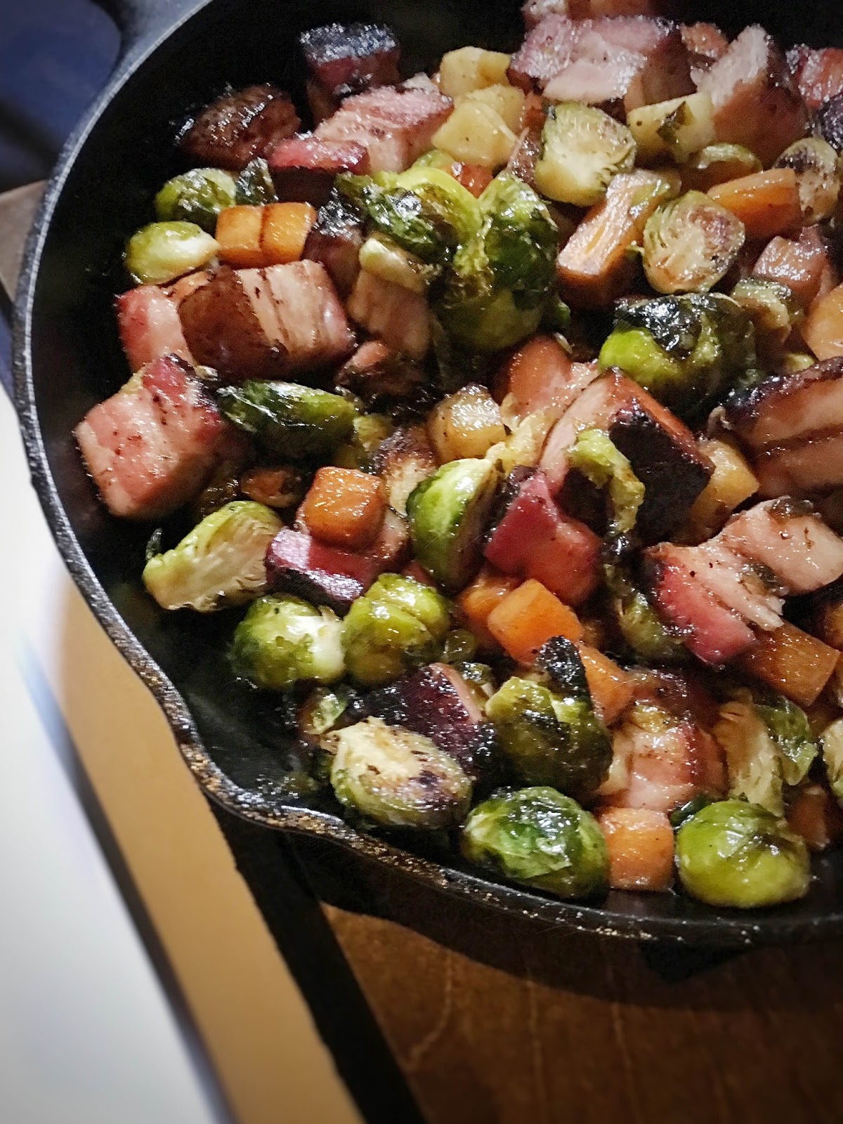 Course 4: Roasted Apples, Brussels Sprouts, Persimmons with Smoked 5 Spice Pork Belly and Candied Walnuts Maple Glaze