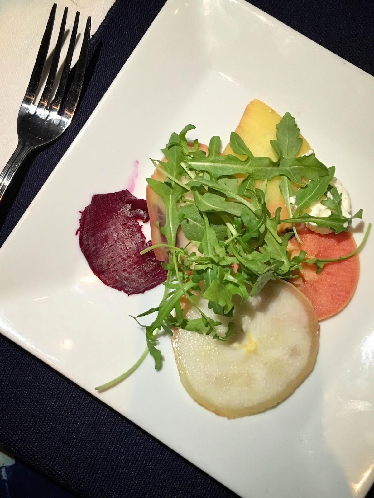 Course 2: Organic Hidden Rose Apple, Pear, Beet Salad with Rocket Arugula, whipped Goat Cheese, Blood Orange Vinaigrette, and Pomegranate Arils