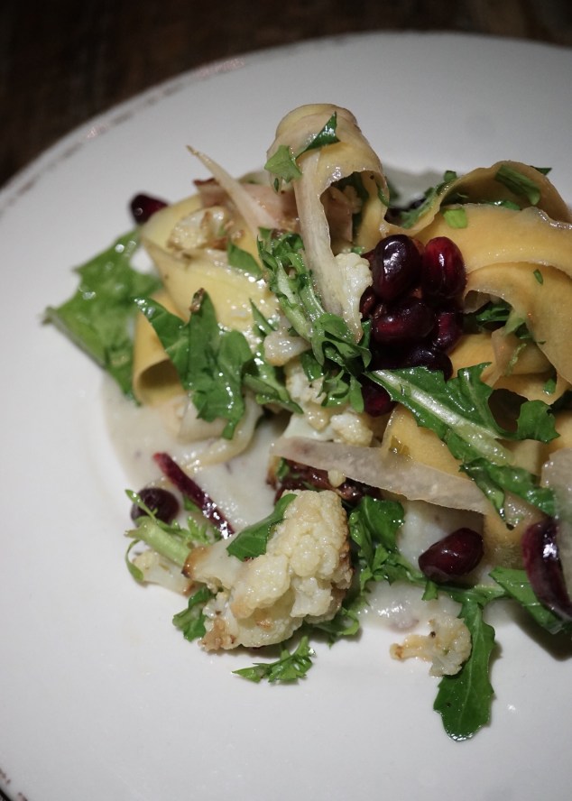 2nd course veered from a warming to cooling sensation in about a 10-minute interval. We were served the Root Vegetable Ribbon Salad meticulously tossed with caramelized cauliflower, arugula, puréed satsumaimo sweet potato and cauliflower, raspberry vinaigrette, pomegranate seeds, and candied pecans. This salad was overall too mild for my palate, yet the boyfriend stated that it was a delicious, well-balanced, and approachable way of intaking those nutritional needs, and at the same time became a mellow “pit stop” before moving on to the main course. Notably, this salad has actually been a seasonally everyday plate during lunch hours — except with some hankering shrimp on top! That said, that may change my mind when I’ll revisit in the daytime.