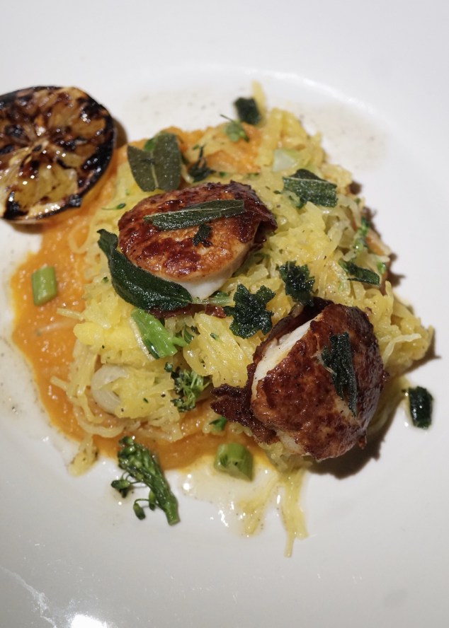 The Seared Sea Scallop dish with practically an equal mouthful of crispy sage, brown butter, sitting atop and around puréed roast maple bourbon butternut squash, roasted spaghetti squash, cipollini onions (also), and an incredibly soft and wonderfully juicy grilled Meyer lemon shyly placed next to the veggies. The presentation could have been much more graceful, while the portion of the proteins lacked brawn compared to the lamb shack. Regardless, my taste buds ignored the size of these perfectly delectable mollusks.